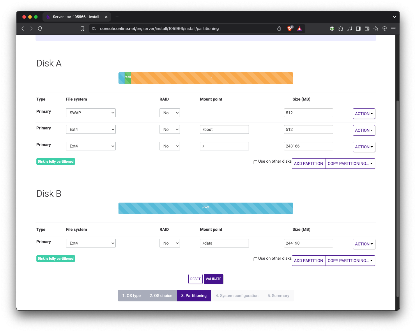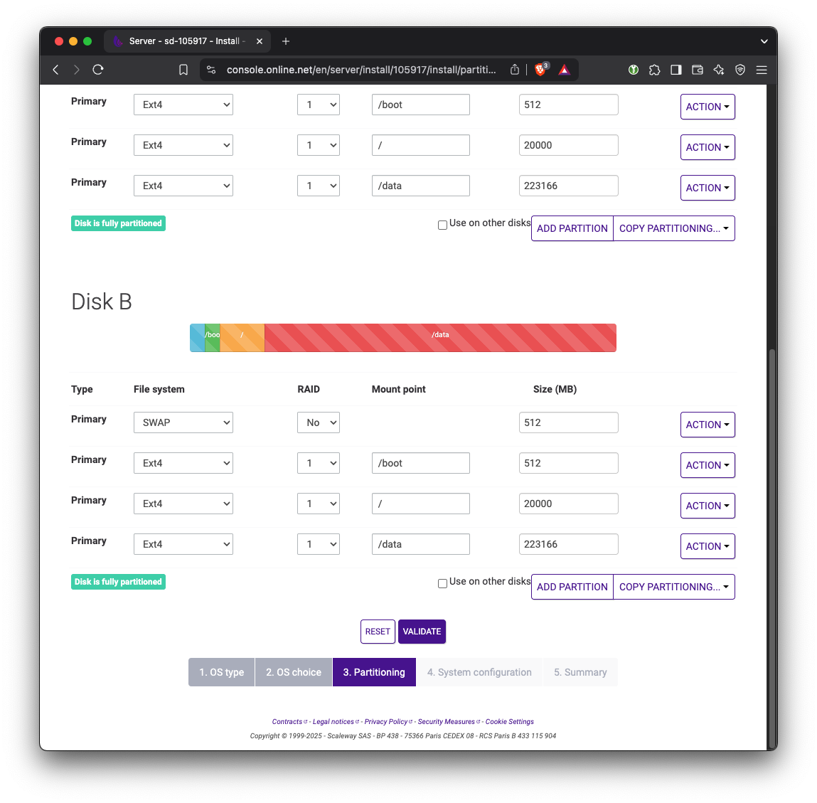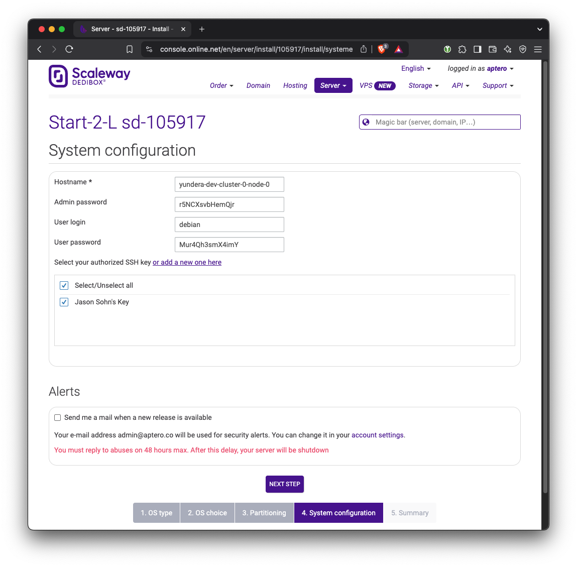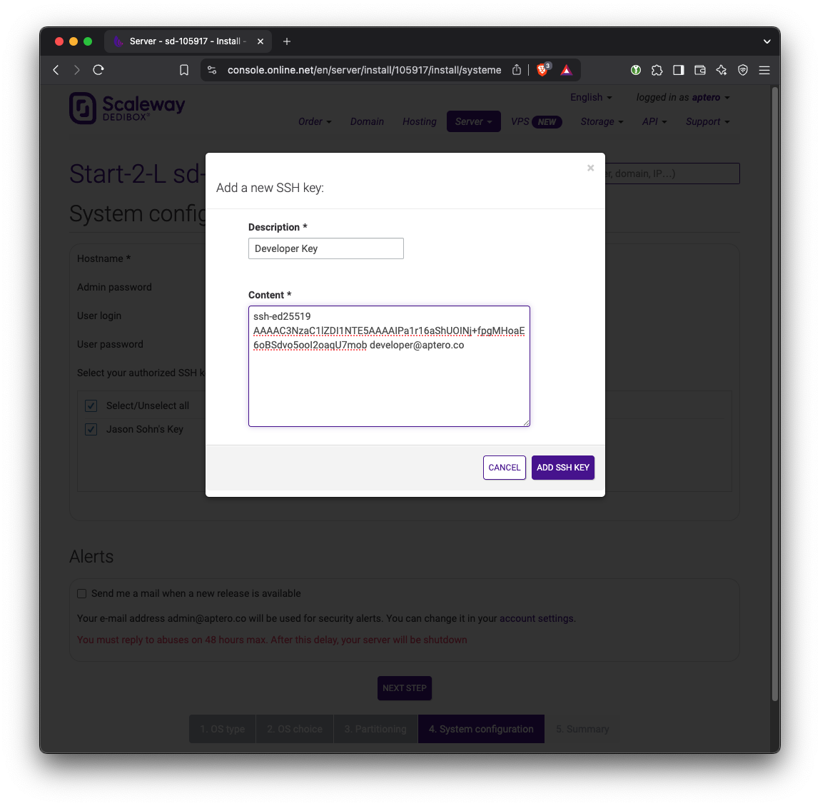 This section does not have an automated playbook because Scaleway Dedibox rental is a month-long commnitment and initial OS install can take up to 1 hour. These considerations made it infeasible to build and test automated scripts within the scope of this report.