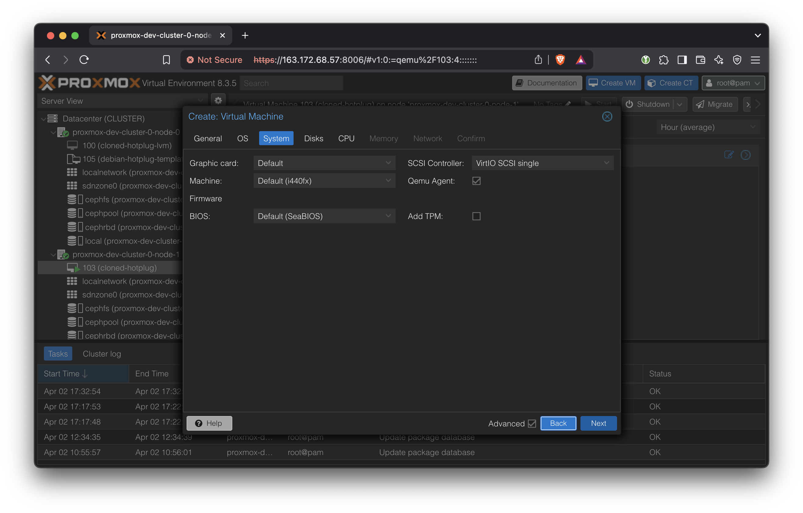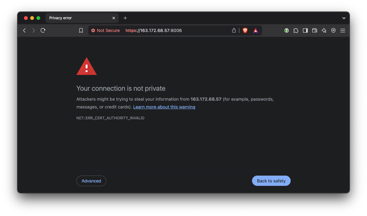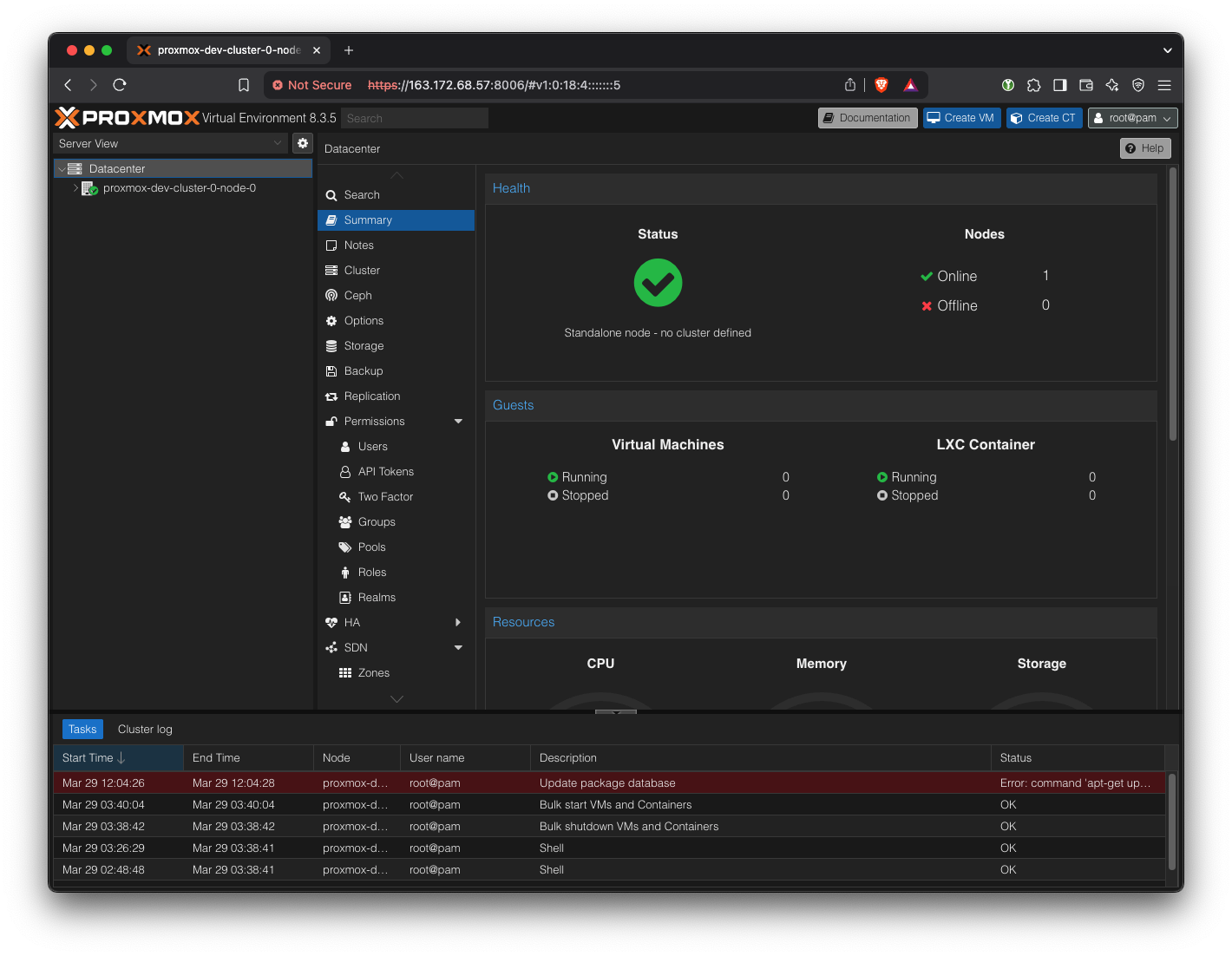 Proxmox uses self-signed certificates which web browsers don’t like - we can safely ignore this and it won’t bother us again.