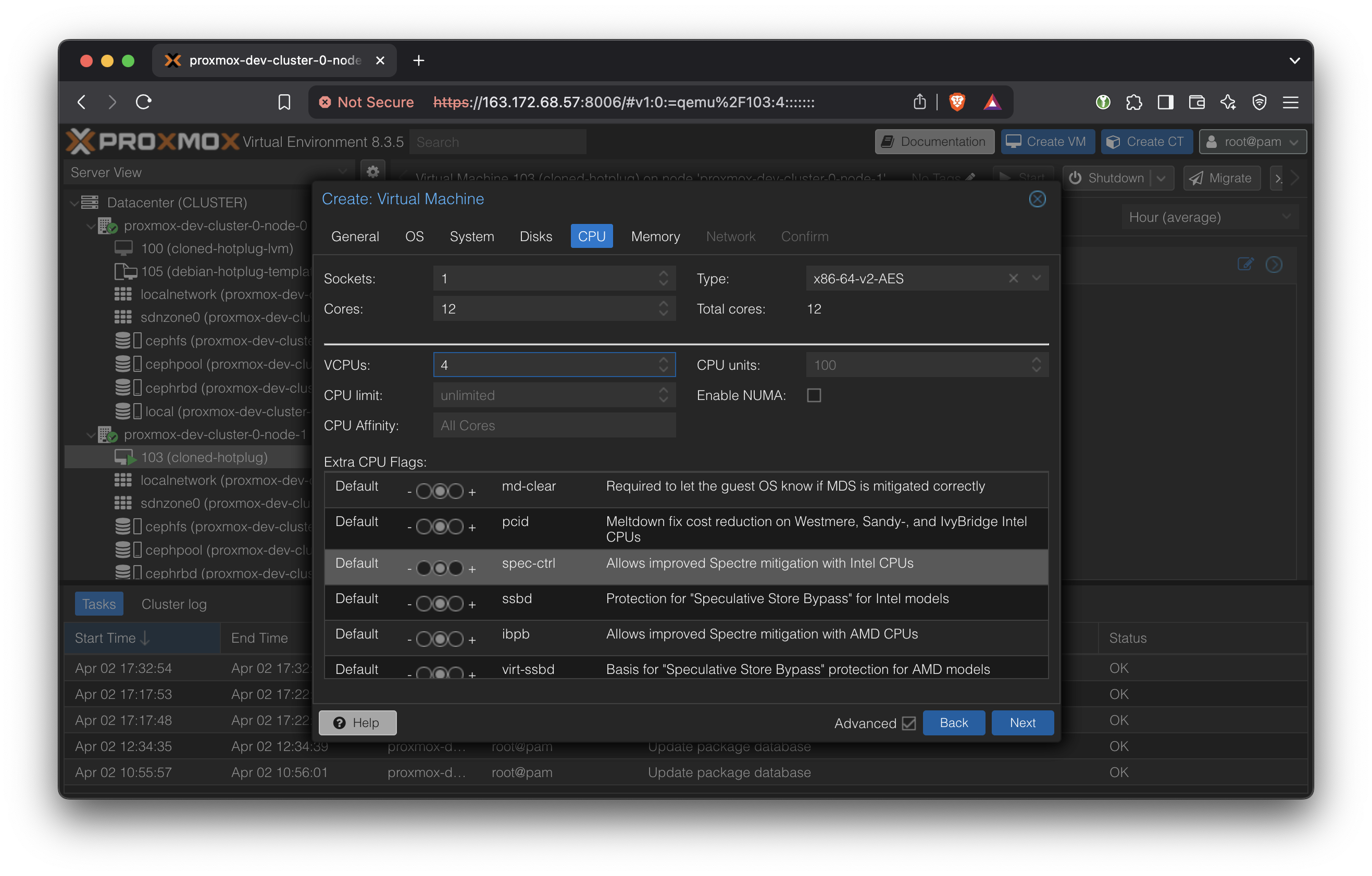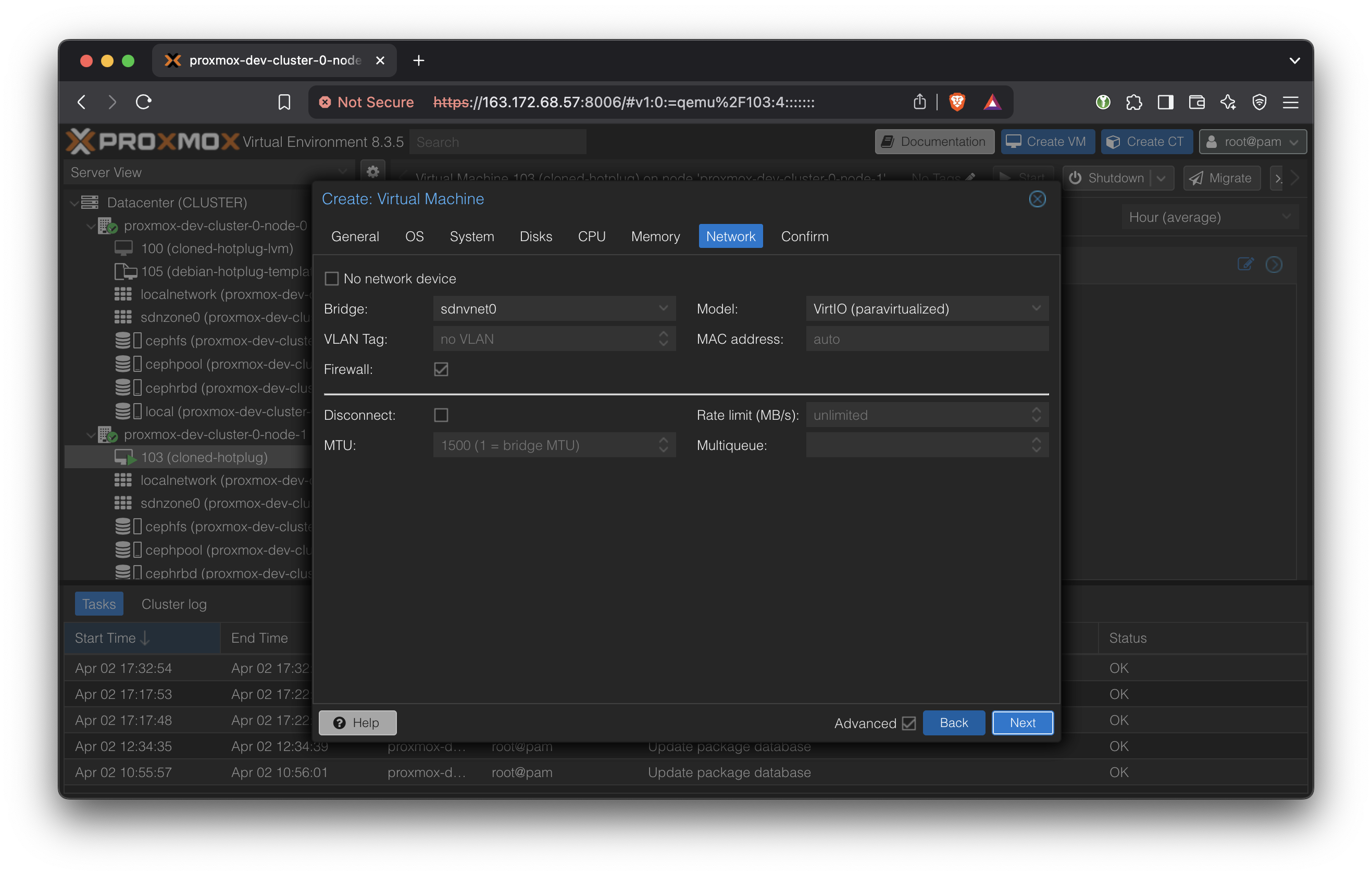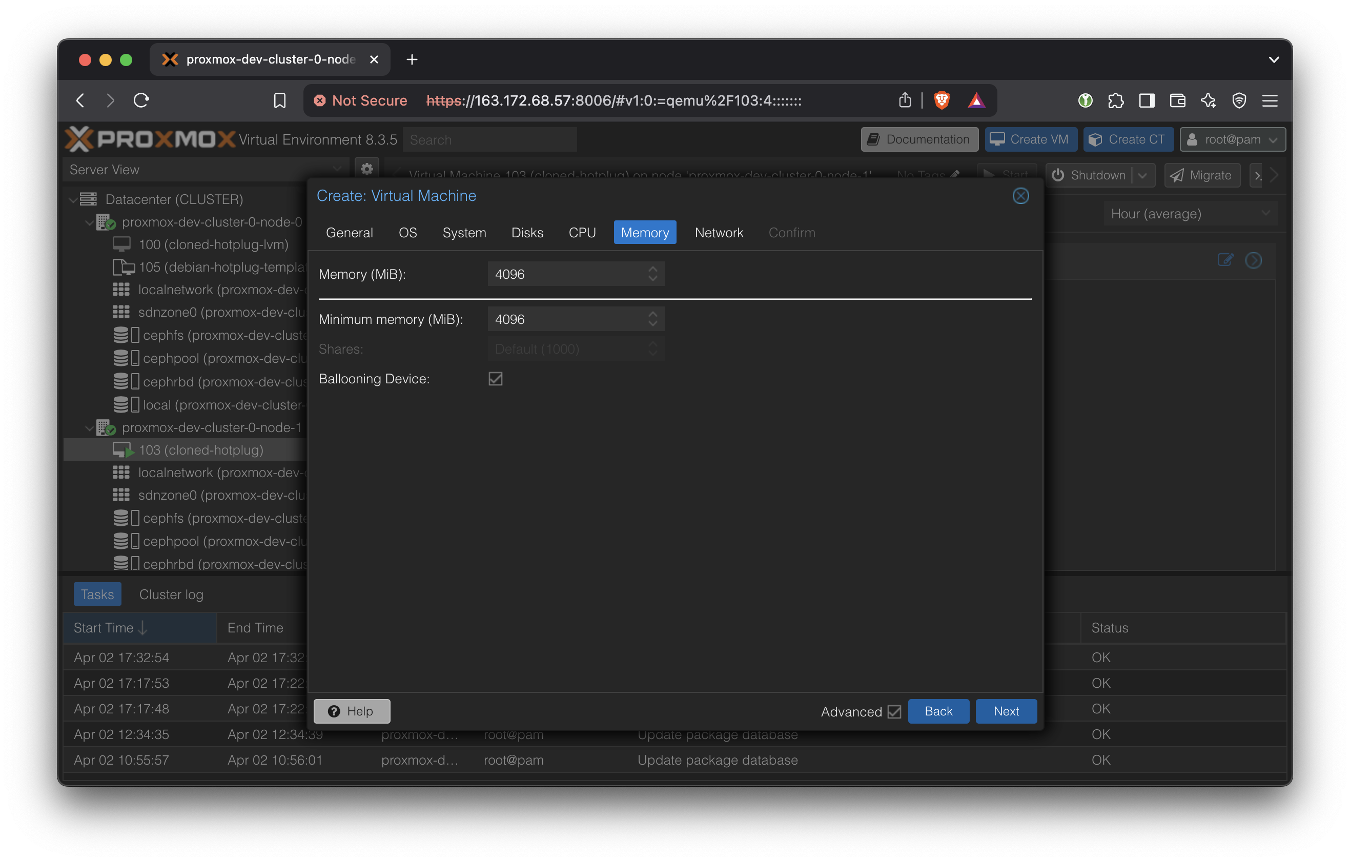 Proxmox uses self-signed certificates which web browsers don’t like - we can safely ignore this and it won’t bother us again.