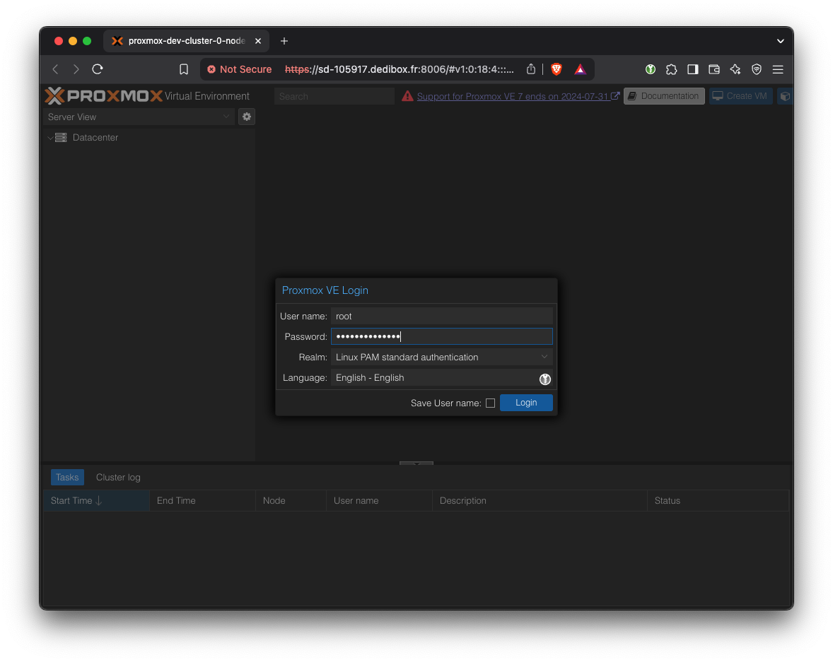 Once Ansible is finished, navigate to the web interface, which is at port 8006 on each of the servers’ public IP addresses: