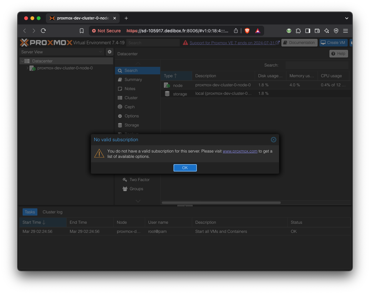 Since the latest version of Proxmox VE that Scaleway offers pre-installed is an outdated (7.x) one, we will install Proxmox VE 8.x ourselves from a Debian 11 base installation. In the process we’ll upgrade Debian from 11 to 12 also.