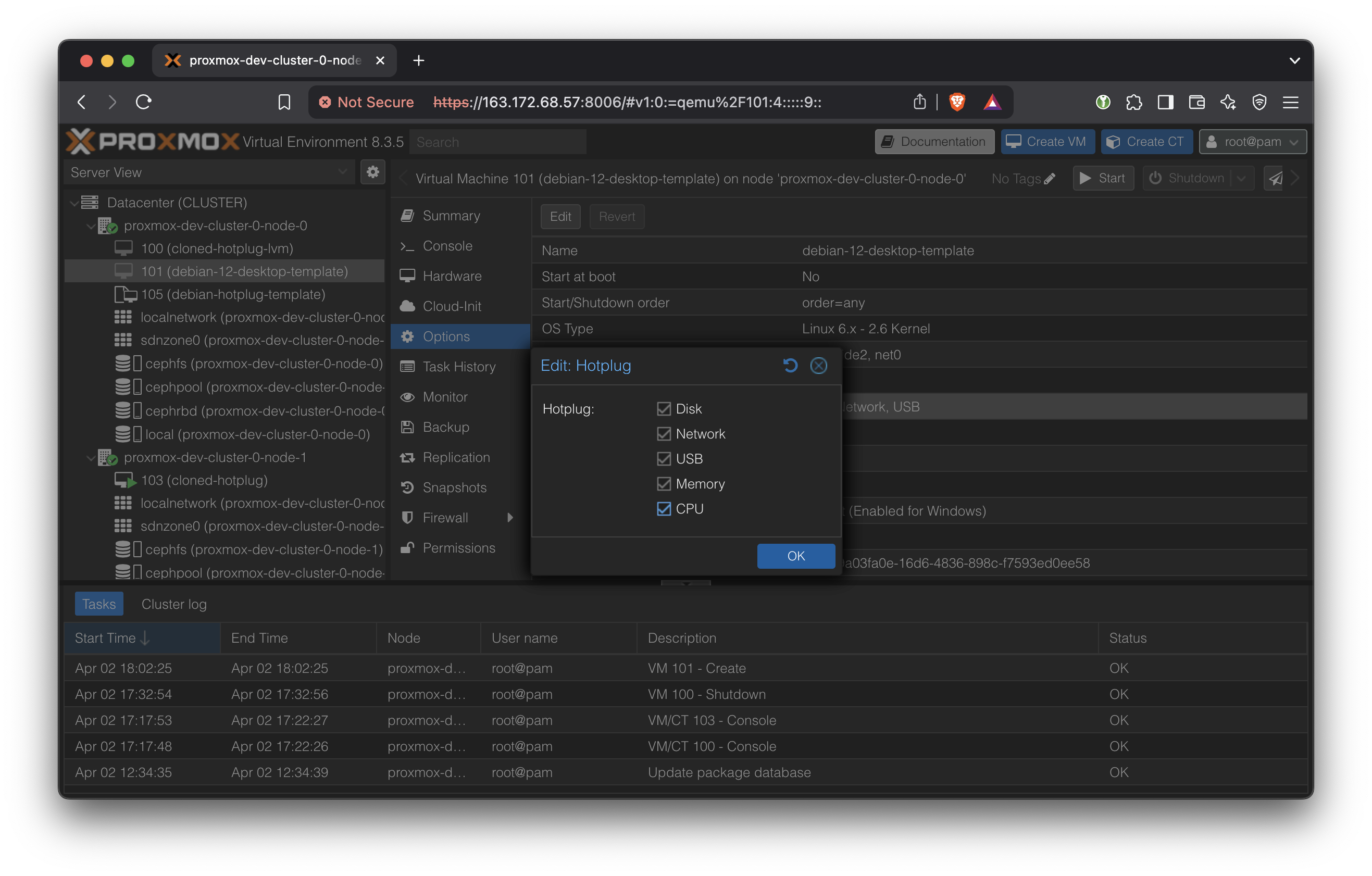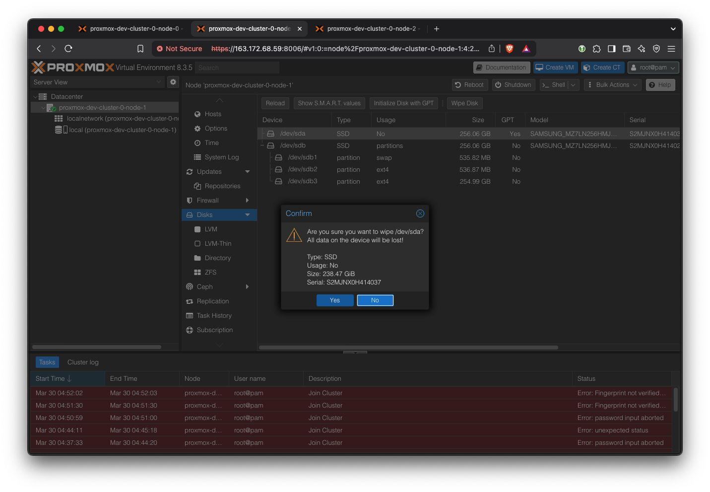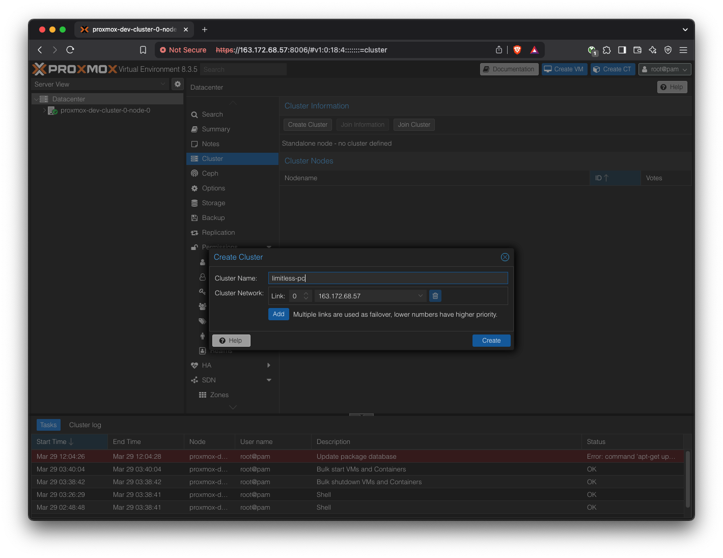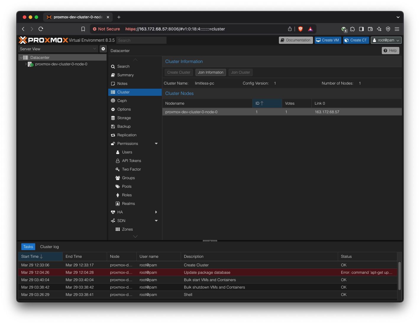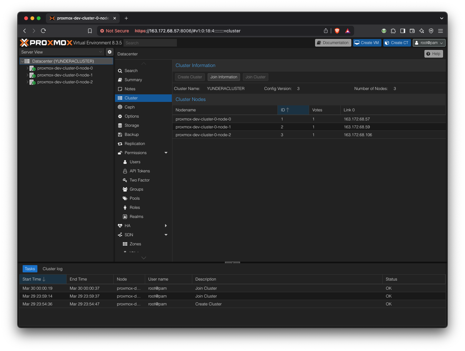 This step cannot be automated via Ansible due to a quirk of the ‘pvecm’ command - specifically, it requires the root password to be entered (even when key-based SSH is set up between the servers) but it cannot be scripted with STDIN or even ‘expect’. More work is required to find a workaround.