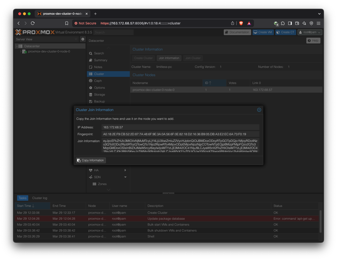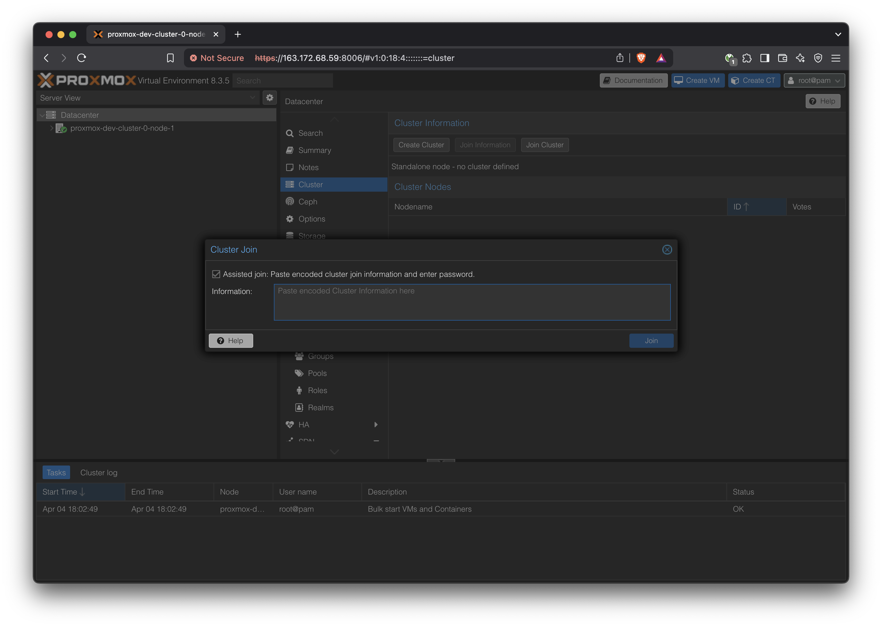 In the same Cluster settings, join the cluster by pasting in the ‘Join Information’ content.
