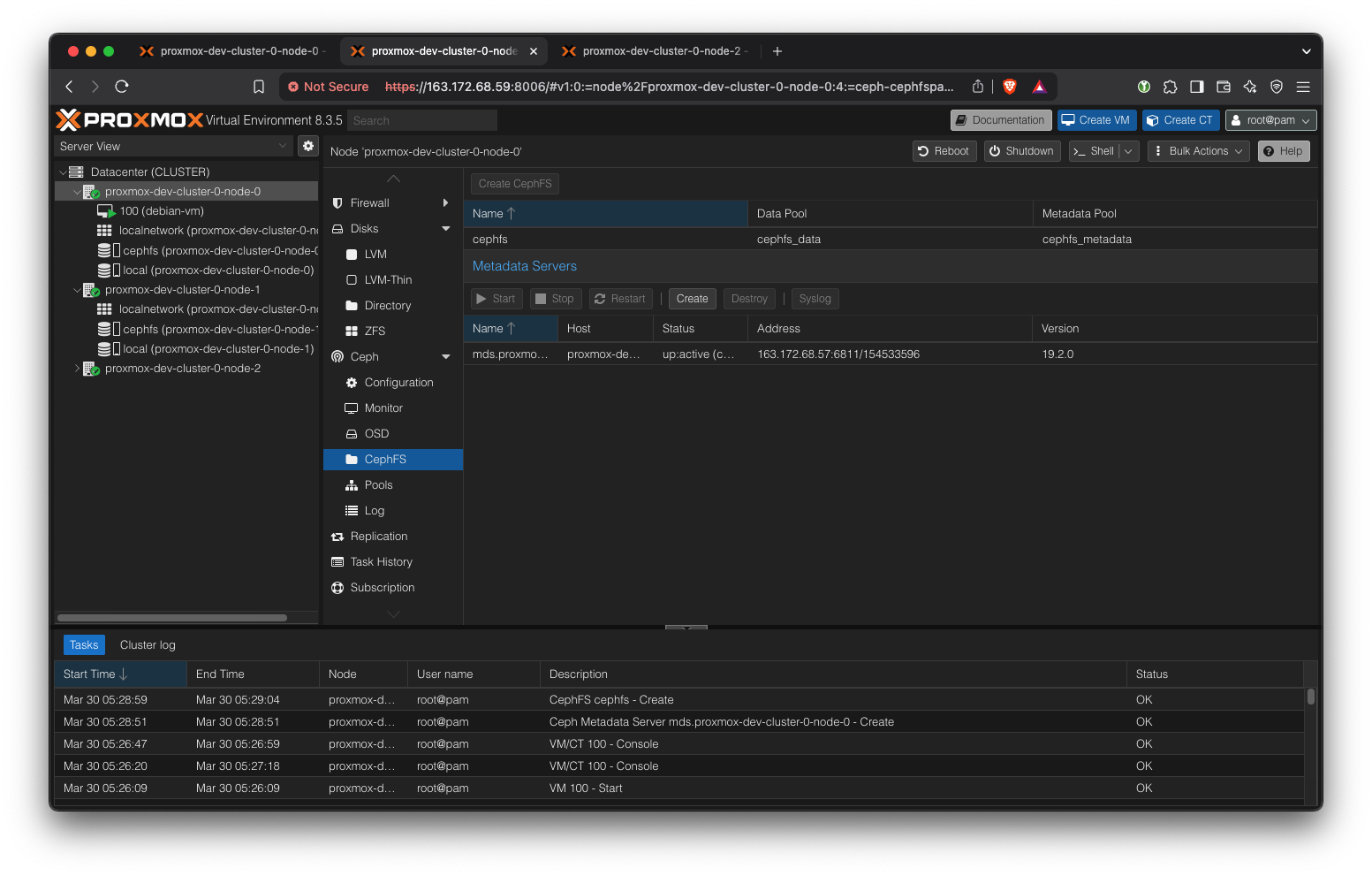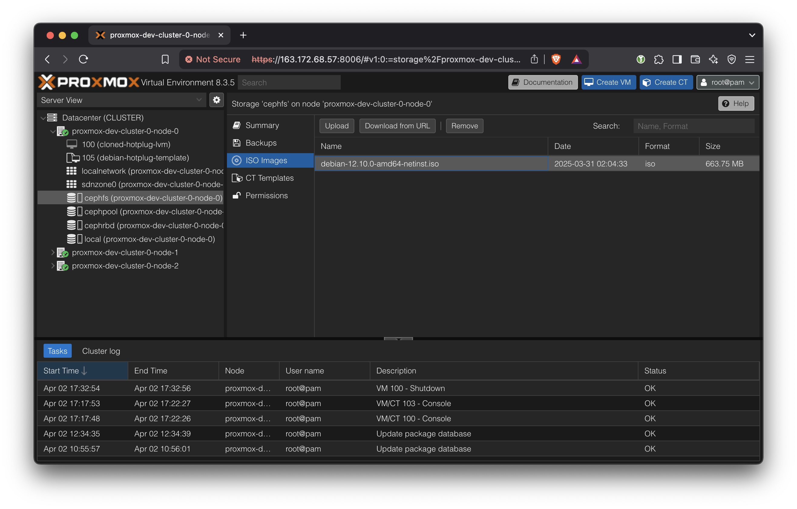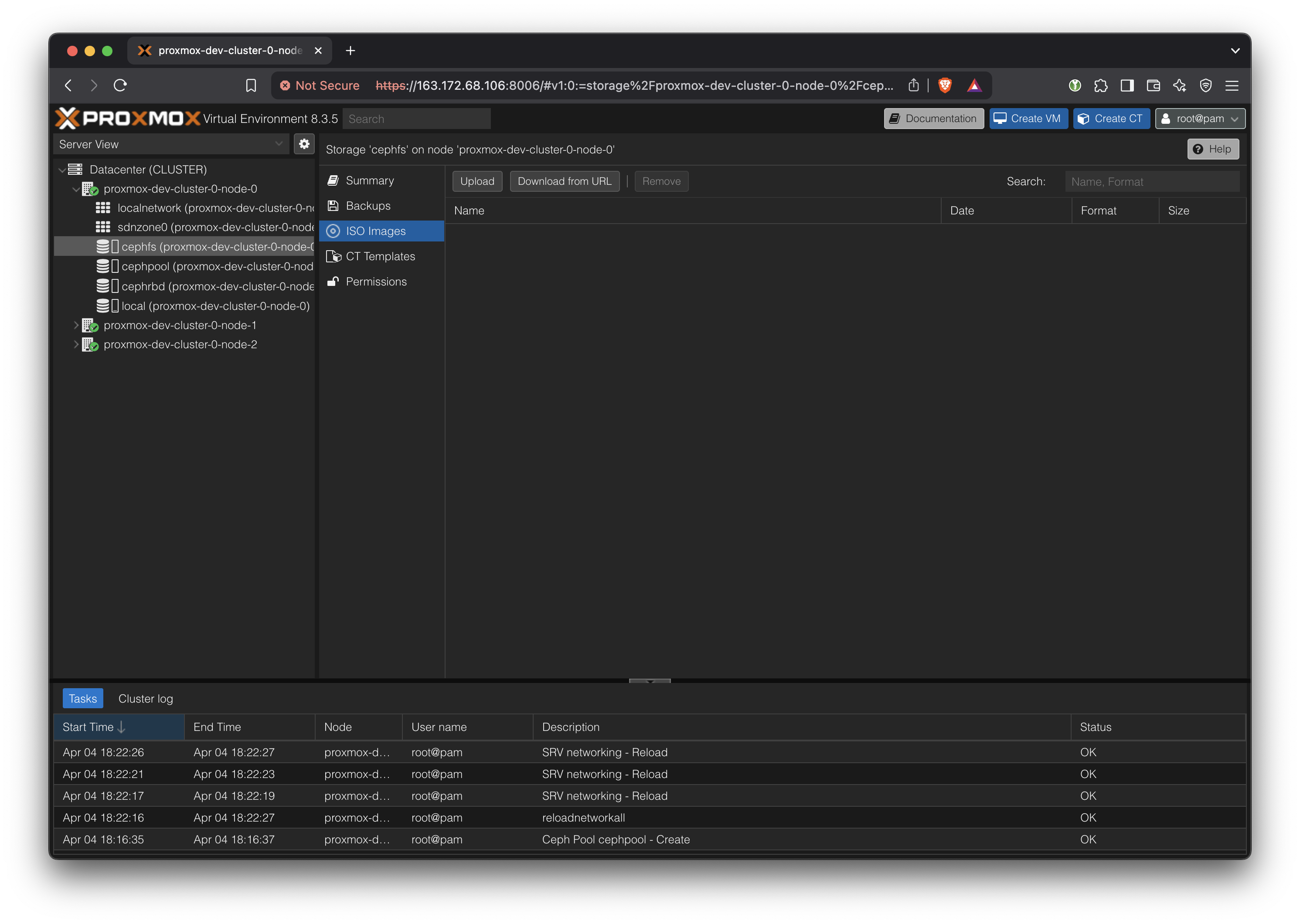 Note that CephFS storage is different from the Ceph RBD storage we defined above. CephFS is just a convenient shared directory to keep metadata like OS ISOs, and RBD is where the actual VMs will store their content.