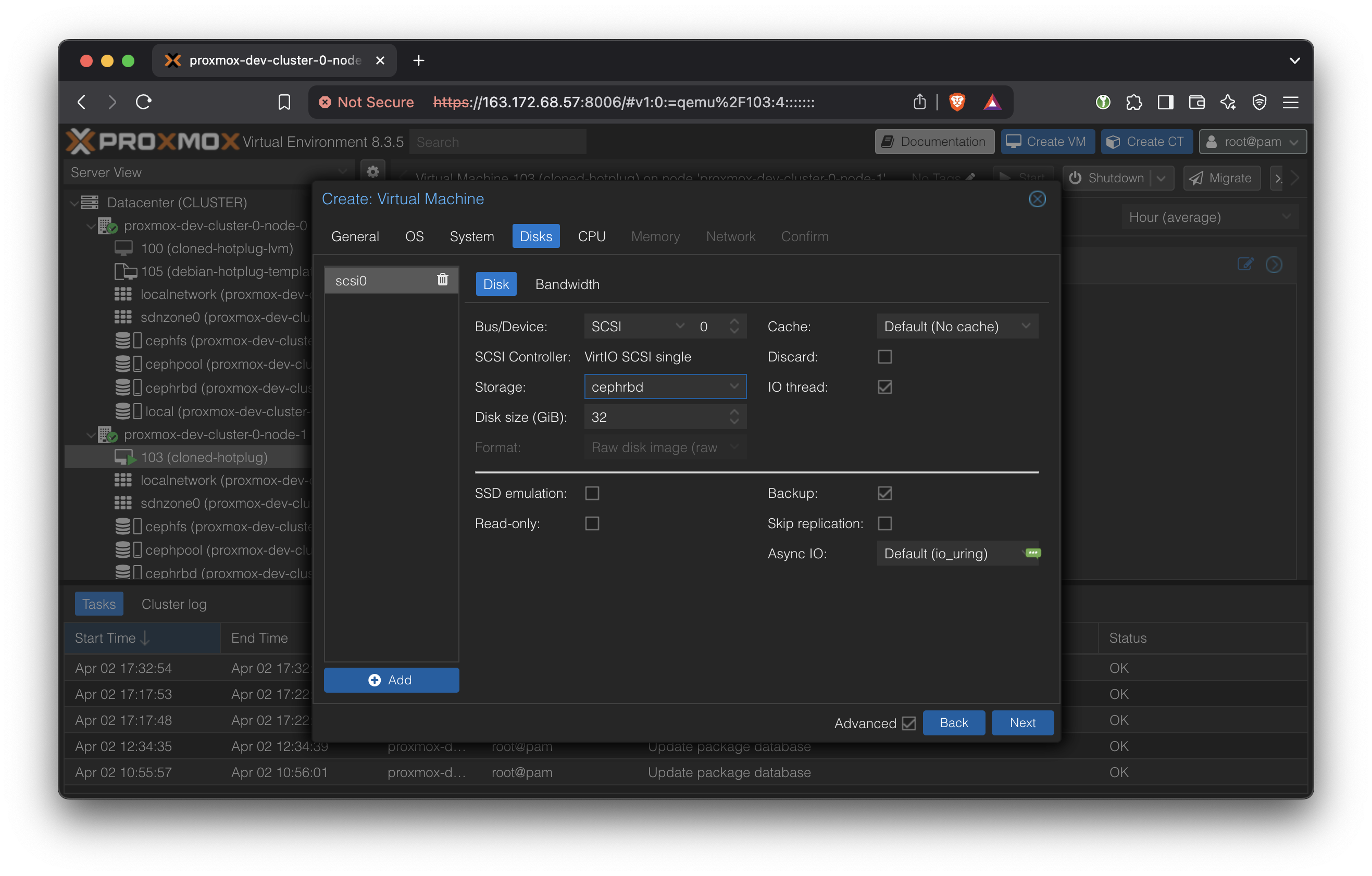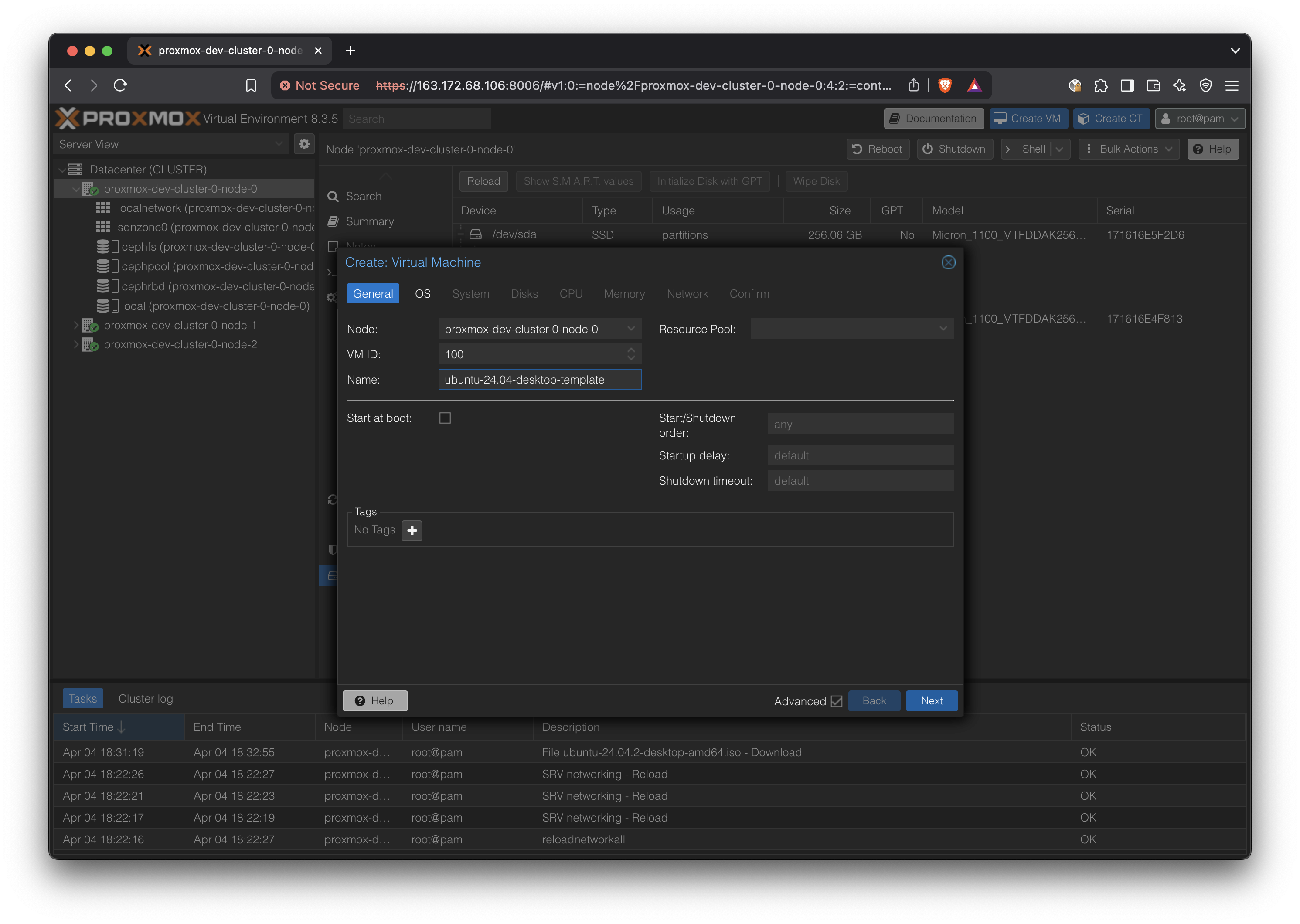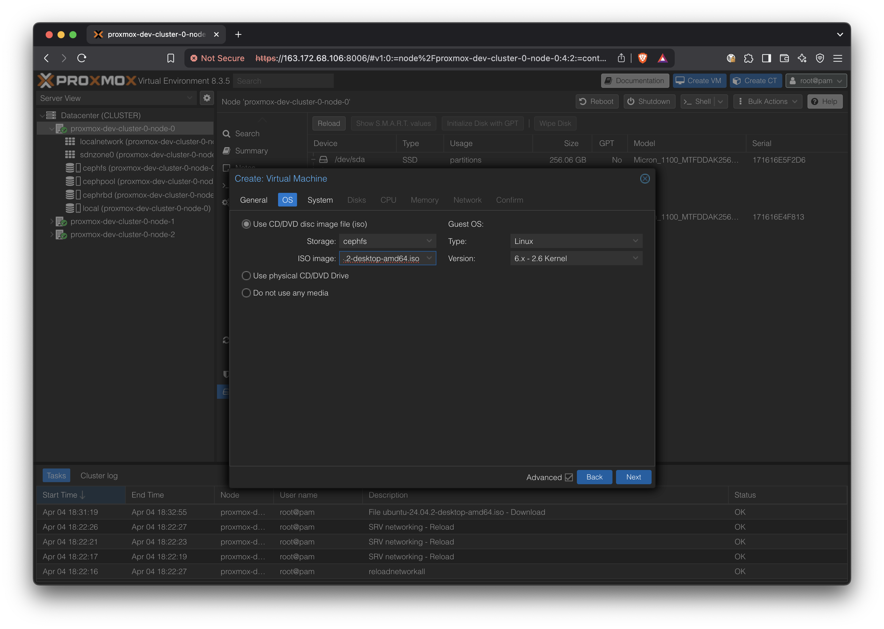 Note that CephFS storage is different from the Ceph RBD storage we defined above. CephFS is just a convenient shared directory to keep metadata like OS ISOs, and RBD is where the actual VMs will store their content.